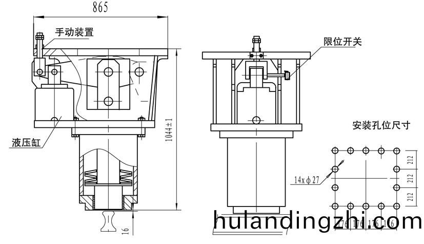 主要设计特点: 常闭式设计、采用液压站集中驱动控制以特制碟形弹簧实现顶轨制动; 摩擦块采用先进的高耐磨钢,性能可靠; 设有限位开关,显示工作状态; 带手动释放,安装维护方便。